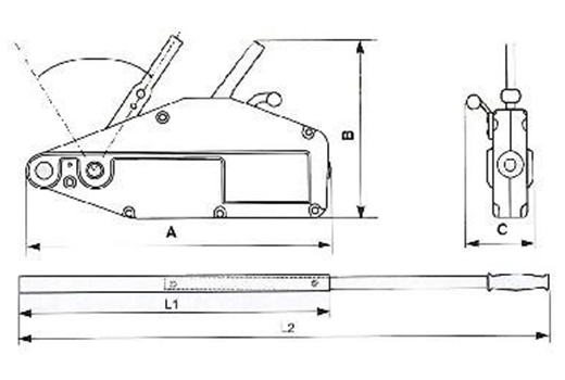 | 型號 | 額定載荷 | 額定載荷時手拉力 | 額定載荷時手柄往復一次鋼絲繩行程 | 鋼絲繩直徑 | 葫蘆重量 | 外形尺寸 |